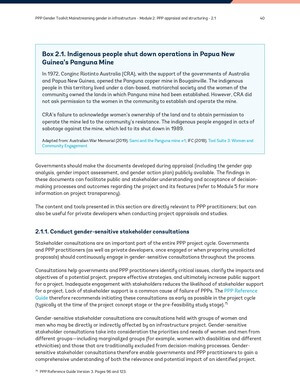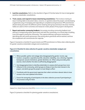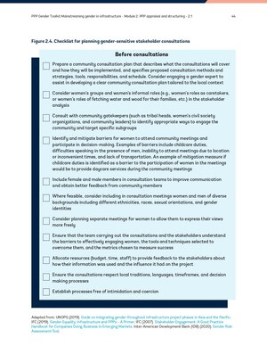 Effective stakeholder consultations are crucial throughout the PPP project cycle to identify critical issues, clarify project impacts, and build public support. Gender-sensitive consultations actively engage women, men, and marginalized groups to understand their distinct needs and priorities. These needs often differ—women may prioritize safety, accessibility, service reliability, and social infrastructure due to caregiving responsibilities and specific mobility patterns, while men may focus more on economic opportunities and efficient infrastructure that supports industry and commerce. Recognizing these differences enables PPP practitioners to design projects that are genuinely inclusive and responsive to community dynamics.