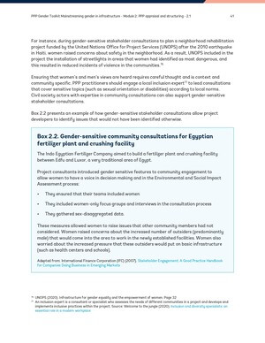 Many IFIs and MDBs address women’s specific needs in their safeguards. To obtain support or financing from some of these institutions requires projects compliance with their gender-related safeguards.