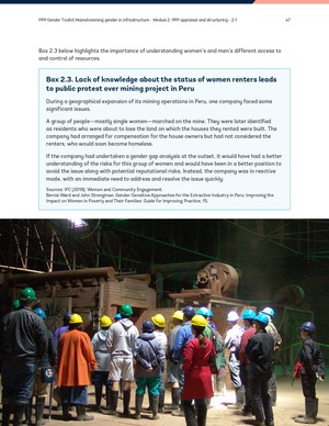 Conducting a gender gap analysis is essential for identifying disparities and ensuring inclusive project planning. In Peru, a mining company faced protests from single women renters who were left without compensation when their rented homes were threatened by expansion. While property owners were compensated, renters—primarily women—were overlooked, leading to social unrest and reputational damage. Had a gender gap analysis been conducted, the company could have anticipated these risks and devised fair compensation measures. Addressing gender gaps not only promotes equity but also reduces project risks and fosters community support.