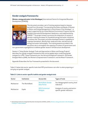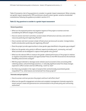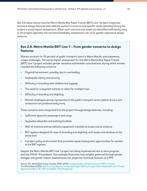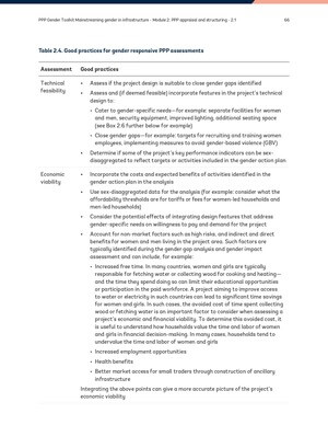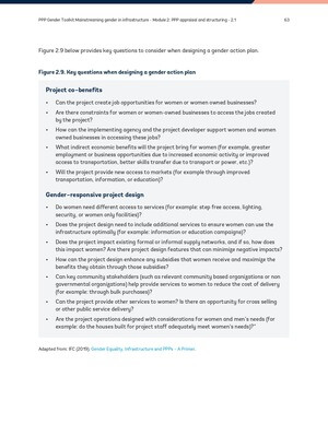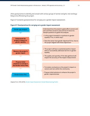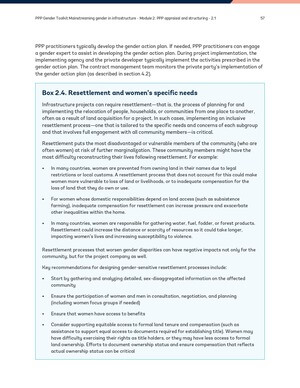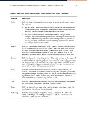 A risk register (a comprehensive list of all the risks associated with the project) should be created when structuring a PPP. Gender-specific risks can be identified through the gender gap analysis, gender impact assessment, and other assessments carried out during the project appraisal.