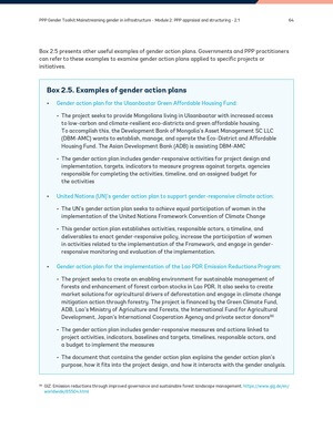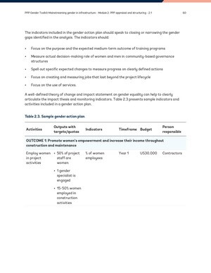 A Gender Action Plan outlines gender-specific goals, activities, roles, responsibilities, timelines, and costs for PPP projects. Built on gender gap analysis and impact assessments, it prescribes targeted interventions to maximize community benefits during project preparation, construction, operation, and social engagement. It sets gender-responsive targets and output specifications, holding private parties accountable through clear incentives and monitoring. To ensure effectiveness, the plan should be integrated into PPP contracts and structured by project phases, including transaction management, land acquisition, construction, and operation. Key indicators track progress on closing gender gaps, enhancing decision-making roles, and creating lasting job opportunities.