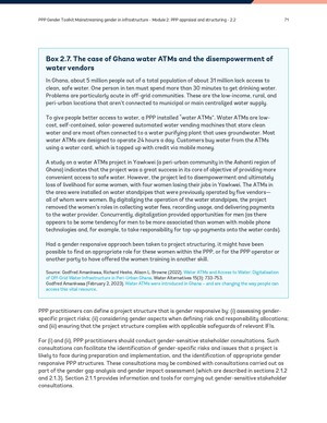 Structuring the PPP means allocating responsibilities, risks, and rights to each party to the PPP contract. Different PPP structuring decisions can affect or empower women.